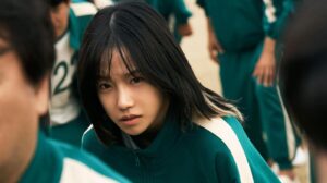 Her curly hair is eye-catching here … down the left side of her face while the hair on the right is tucked behind her ear.